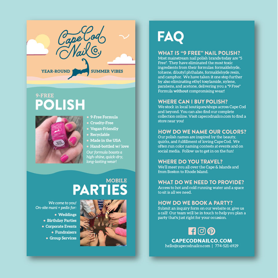 Cape Cod Nail Co.'s gorgeous color palette of nail polishes and fun color names draw you in right away. Hand-made lettering and color-blocked illustrations rebranded the nail polish and mobile parties company. Along with new packaging designs, we developed the marketing, copywriting, taglines, mission statement and brand values. Vinnie and Claudia created a wrap around mural for the nail salon in Mashpee Commons over the course of two days.